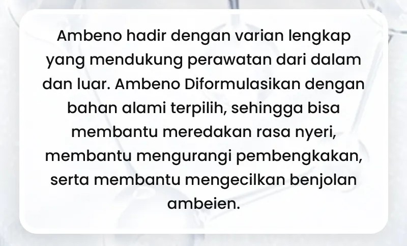 Ambeno adalah rangkaian produk berbahan alami yang dirancang untuk membantu mengurangi rasa tidak nyaman akibat ambeien. Dengan varian lengkap untuk perawatan dari dalam dan luar, Ambeno membantu kamu untuk bebas dari ambeien dengan cara mudah & tanpa efek samping.